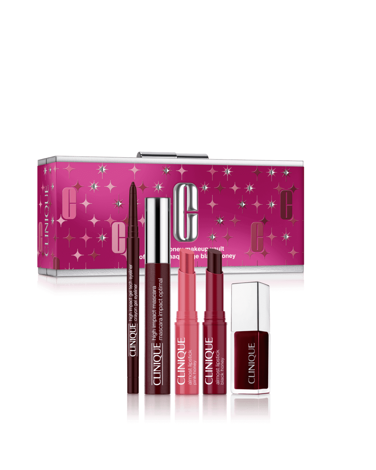 Du mi-rouge à lèvres culte qui a tout lancé jusqu’aux cils spectaculaires, ce coffret maquillage met en valeur les 4 teintes iconiques de Clinique, avec en prime un mi-rouge à lèvres Pink Honey.